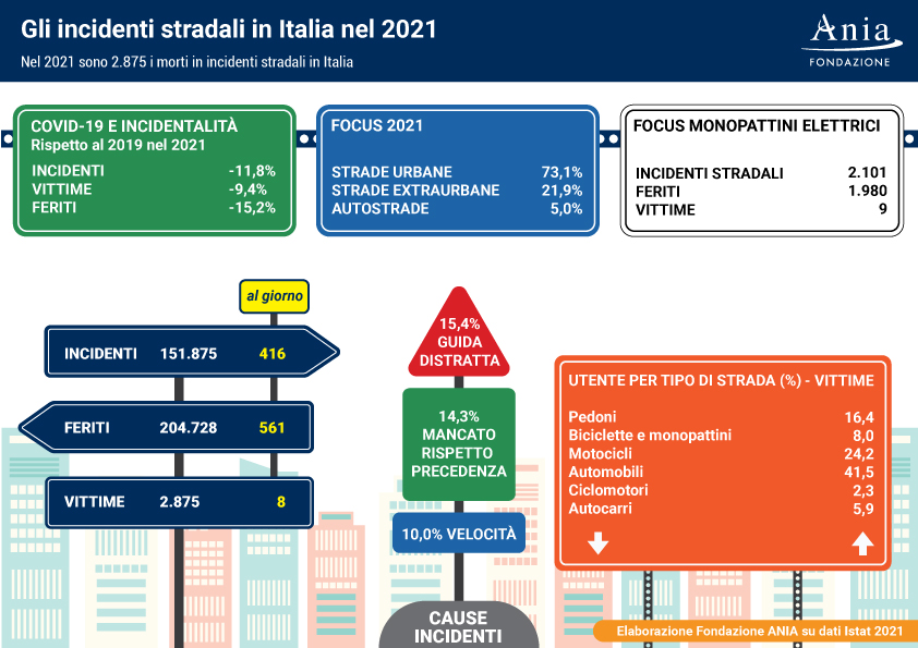 L'andamento dell'incidentalità stradale e della mobilità in Italia nel 2021 continua a risentire degli effetti della pandemia, con un calo degli incidenti nei mesi di gennaio e febbraio rispetto al 2020 e un aumento significativo nei mesi successivi. È quanto emerge dal Rapporto ACI-ISTAT sugli incidenti stradali 2021: sono 2.875 i morti sulle strade italiane nel 2021 (+20% rispetto al 2020), 204.728 i feriti (+28,6% rispetto all'anno precedente) e 151.875 gli incidenti stradali (+28,4% rispetto al 2020), valori in crescita rispetto all'anno precedente che si confermano, però, ancora in calo se confrontati con il 2019 (-9,4% vittime, -15,2% feriti e -11,8% incidenti). Luglio è il mese peggiore per numero di incidenti e vittime, agosto per indice di mortalità. Evidente l'impatto degli incidenti stradali sui costi sociali con 16,4 miliardi di euro spesi, corrispondenti allo 0,9% del PIL.
