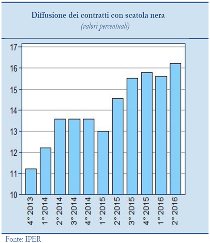 Infatti, il 16,2 per cento dei contratti stipulati nel secondo trimestre del 2016 prevede una scatola nera. La diffusione del dispositivo è peraltro piuttosto eterogenea sul territorio: laddove il premio medio è più alto, è maggiore la percentuale dei contratti con scatola nera (in Campania, Sicilia, Calabria e Puglia la percentuale di contratti con scatola nera supera il 20 per cento mentre invece in Trentino A.A., Friuli-V.G., Veneto e Valle d’Aosta si registrano percentuali inferiori al 10% .